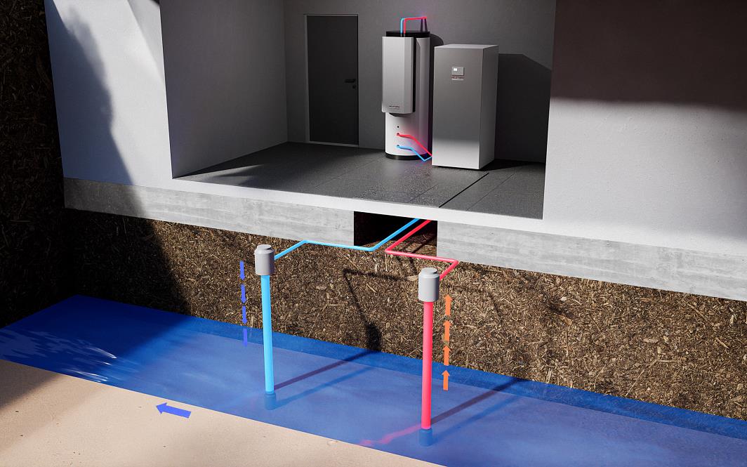 Über einen Förderbrunnen wird Grundwasser entnommen und die darin enthaltene Wärme über einen Wärmetauscher an das Heizsystem übertragen. Das abgekühlte Wasser fließt anschließend über einen Schluckbrunnen wieder zurück in den Boden. Durch diesen geschlossenen Kreislauf bleibt das natürliche Gleichgewicht des Grundwassers erhalten.