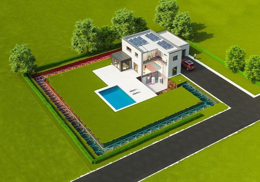Ein frostsicheres Sole-Wasser-Gemisch zirkuliert durch die im Erdreich verlegten Ringgrabenkollektoren. Die dabei aufgenommene Wärme wird über einen Wärmetauscher an das Heizsystem übertragen. So liefert das System zuverlässig Heizenergie und Warmwasser, während das Erdreich nachhaltig genutzt wird.